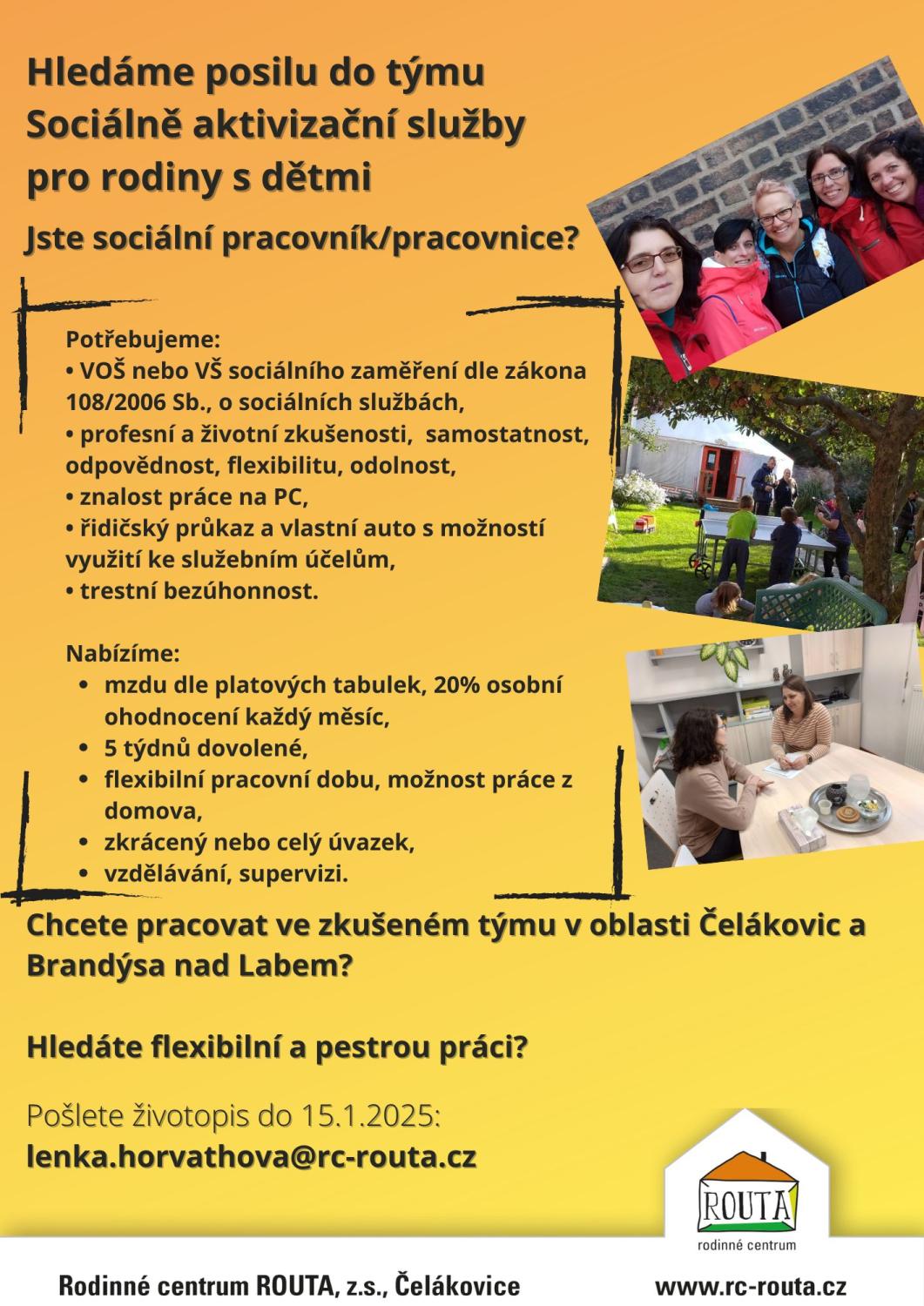 RC Routa mezi sebe ráda přijme sociálního pracovníka s působením v oblasti Čelákovic a Brandýsa nad Labem.